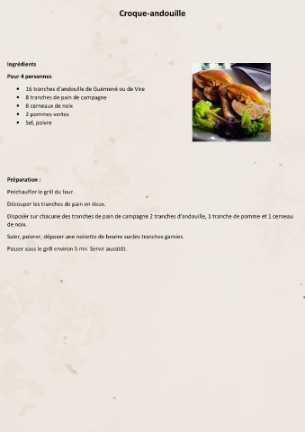Disposer sur chacune des tranches de pain de campagne 2 tranches d'andouille, 1 tranche de pomme et 1 cerneau