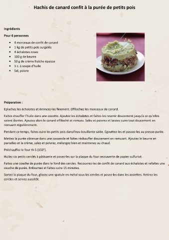 Hachis de canard confit à la purée de petits pois