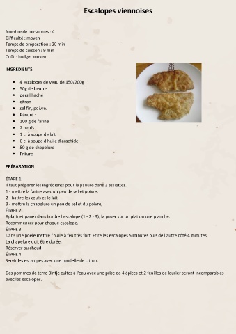Dans une poêle mettre l'huile à feu très fort. Frire les escalopes 5 minutes puis de l'autre côté 4 minutes.
