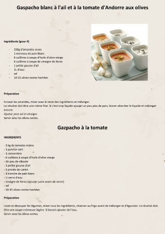 Gaspacho blanc à l'ail et à la tomate d'Andorre aux olives